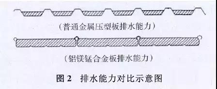 2)最大限度地利用面板橫截面積排水,排水效率高。與普通金屬壓型板排水能力對比,見圖2;